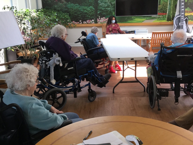 At first, the sessions lasted 15 minutes, but they quickly grew so popular that they are now 45 minutes long, twice weekly for first and second floor skilled care residents. Every session starts with an affirmation of gratitude, as residents repeat after Dr. Rox: “Thank you for another day.”