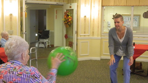 Jennifer Parsons keeps residents moving forward! She is leading Homeland residents in exercises meant to maintain flexibility. “Feet in front of you, roll your ankles,” she instructs. “One, two, three.”