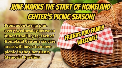 From noon to 1:30 p.m. every Wednesday between June 12 and July 24, each of Homeland Center’s six care areas will have their own picnic in the Chet Henry Memorial Pavilion, located in the lush Fifth Street gardens. Organized by